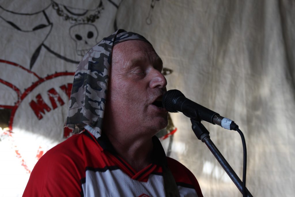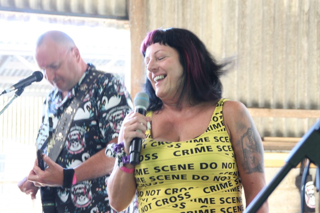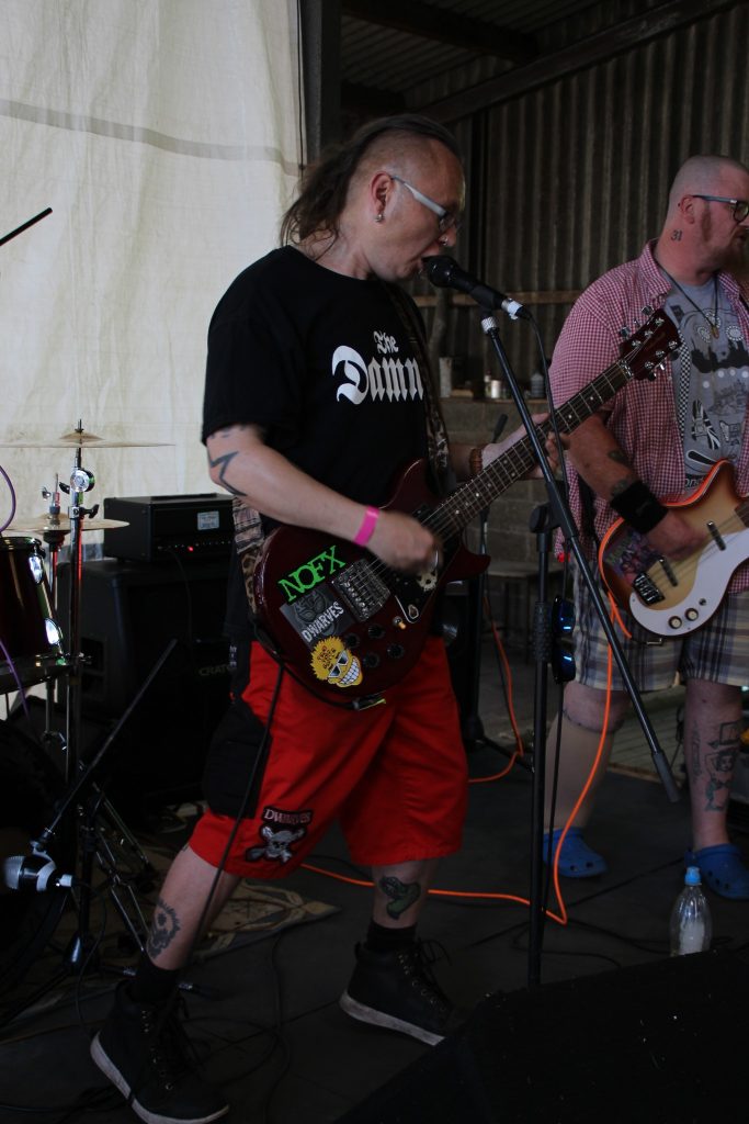 Day 2 starts off with the usual groans around the field of sore heads and various bodily noises. The boiling of kettles for that first brew of the day, and as the morning progresses, the sounds and smell of frying bacon for breakfast. The weather is stunning, warm and knowing the heat will return, as it transpires, not quite as hot as yesterday. The usual routine is a chill out time until about 12 ish, where a good chunk of the tenty types head on down o the local pub for a pint or 2. On arrival at The Old Crown, someone had the sense to put a kid’s paddling pool in the beer garden, and yes, the obvious happened. Punks old and young, stripping down for a much-needed dip in the sun, ice lollies and pints of cider at the ready. Anyone coming into the pub must have wondered what the hell was going on. A short time later, I and few others head back to the farm to get the BBQ on and cook for our little gang. Once fed, its time to head back to the cow shed for the day’s entertainment.