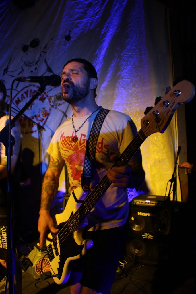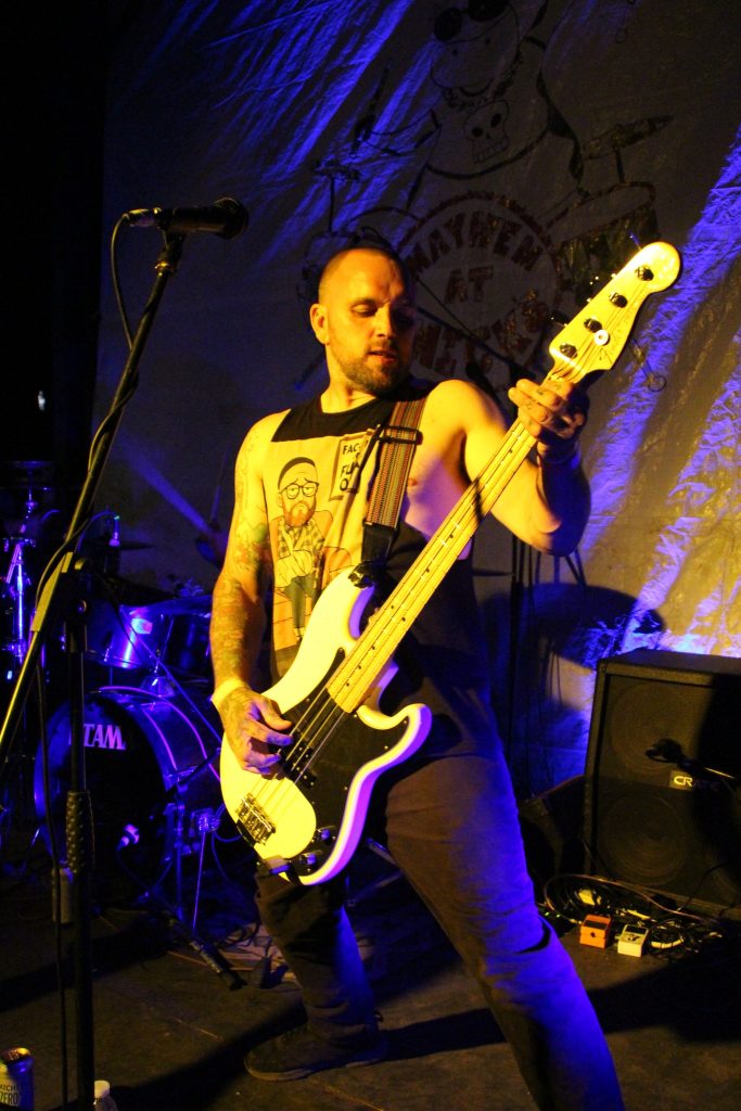 The Puncturists have their first taste of Mayhem. Not been around that long, and off shoot if you like from System of Hate. Gail the singer, and I hope you don’t mind me saying this, states at the start of one of the songs, that she only started singing in band as a “mature” lady. It didn’t show, forever grinning and smiling as she ploughed through the set, clearly loving what she a and the boys do, coming into the crowd, mic in hand having the time of her life. Vocally reminiscent of early female fronted punk bands, she has clearly stepped up to the mark, which could be seen by looking at the crowd. It’s generally a struggle for new bands to make their mark, but these seem to have done quicker than most. Great set.