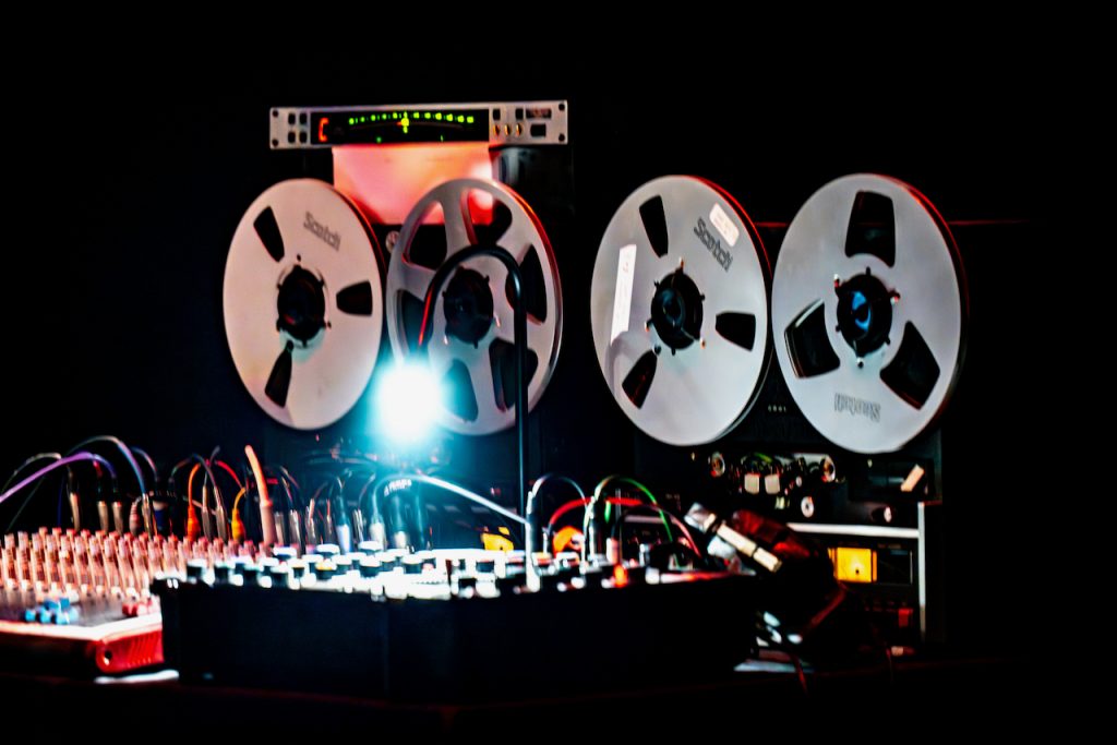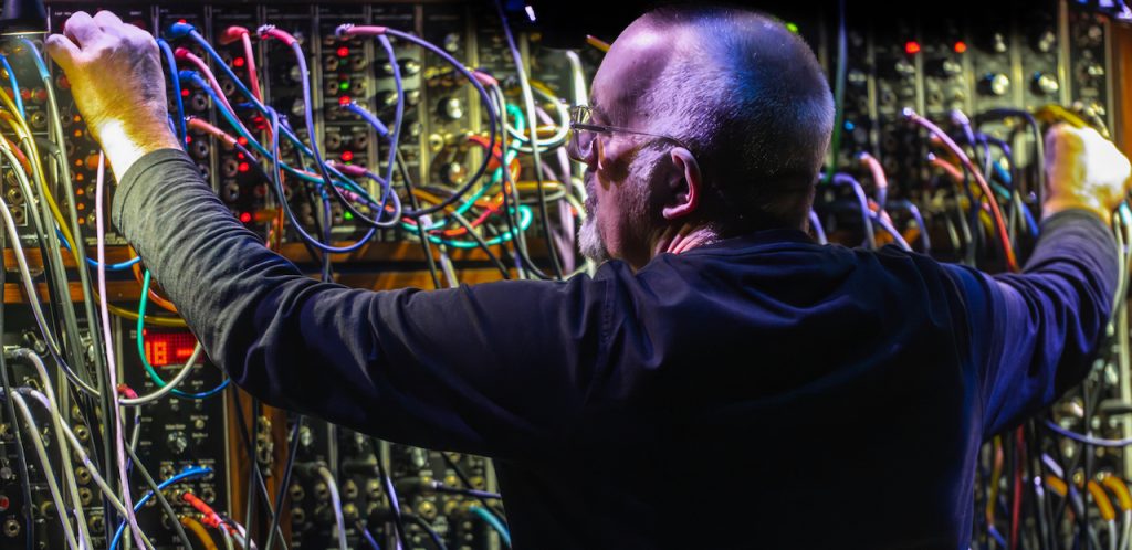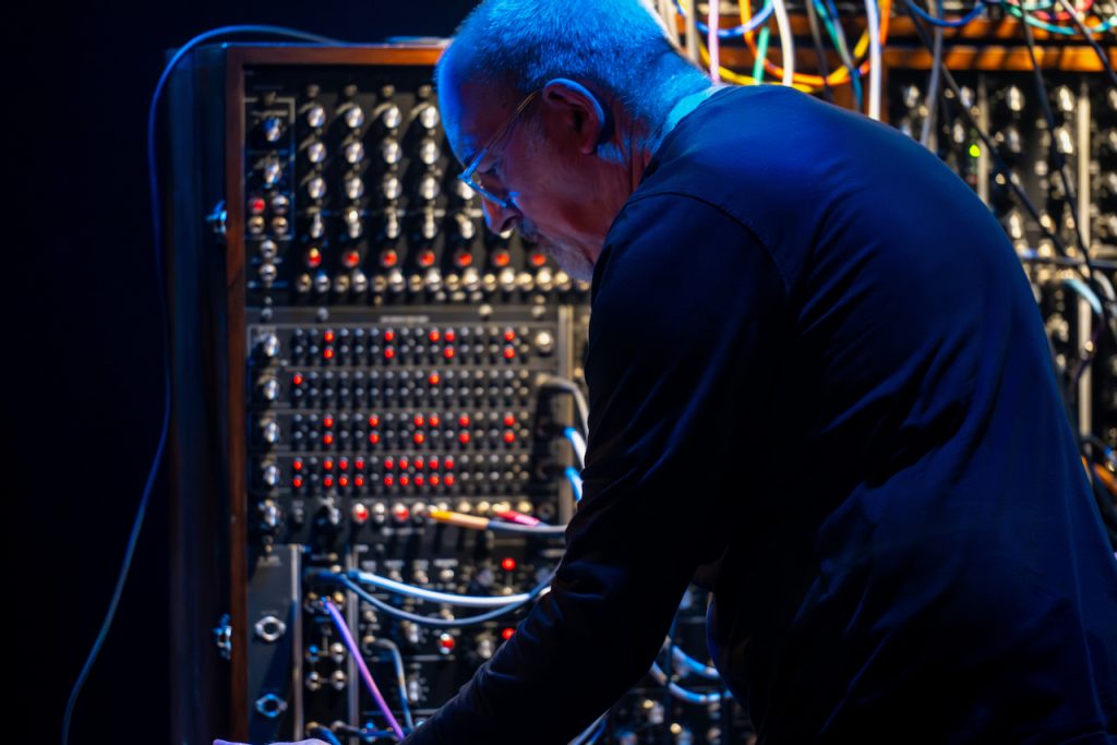 Visually, its an array of analogue electronics glowing in the near dark set under a constantly shifting projection of mainly black and white constantly changing sharp shapes interspersed with floating real time projections of what is happening in front of us. Musically its deep repetitive almost classical in its embrace. A near perfect sound at the Capstone adds some perfect definition to it, especially the sub sonics and the vast music machine is used expertly and in a no fuss manner that allow the audience to just enjoy listening to the music.