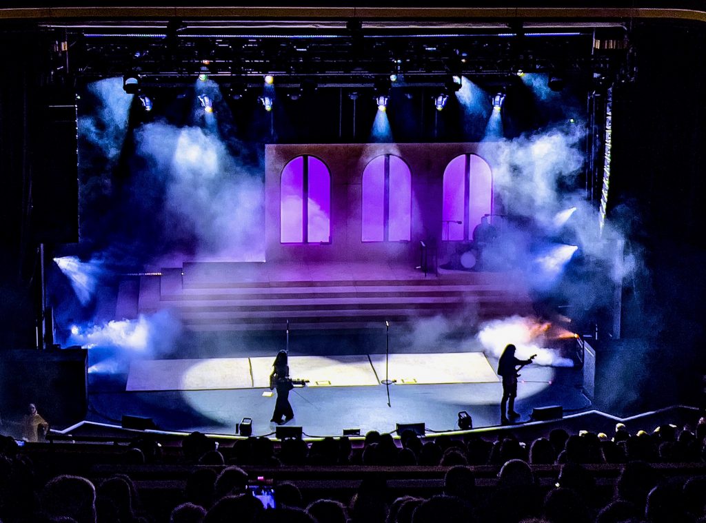 Khruangbin appear suddenly out of the dark, the three windows in the stage set behind them reminding those of us of a certain age of Playschool. They launch effortlessly into what will be an hour and a half or so of instrumental (with some vocal stylings) music. The three look small on the large stage but they are constantly moving around with some stylised dance steps.