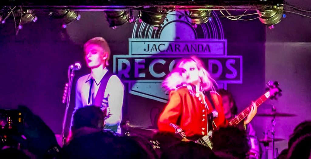 Issey dressed all in red with long flowing blonde hair on bass. Mathew with his strawberry blonde short hair kicked off the album launch with Daydreaming the latest single off the new album. A David Bowie cover Suffragette City .An unexpected change happened when Cal a member of the crowd claimed he could play ” Today’s gonna be our day”just as good as Mathew.It worked well he played it spot on with Mathew just doing the vocals and playing the tambourine The title track off the album and other tracks off the album followed PopStar and Johnny don’t be scared we’re all giving a play. After a short break they came on to do an encore a previous as single ” More More more”. A first for me, an encore at an album launch.