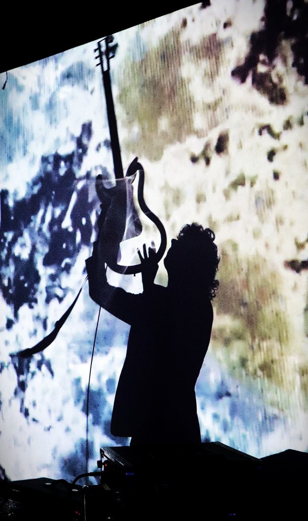Sly & the Family Drone set up in the round half way down the main IWF hall. There are drums galore, pieces of electronic gear and a violin. Its a jumble of equipment and their sound is the sound of riots. For me one of the stand out performances of the festival. It appears improvised around solid structures and keeps raising in intensity. Noise generators and drums underpin it all then sudden dropouts to allow the violin to take more than a bit part. A solid wall of noise at times but with highly controlled percussive sounds that keep increasing in intensity with everything joyously blurring together.